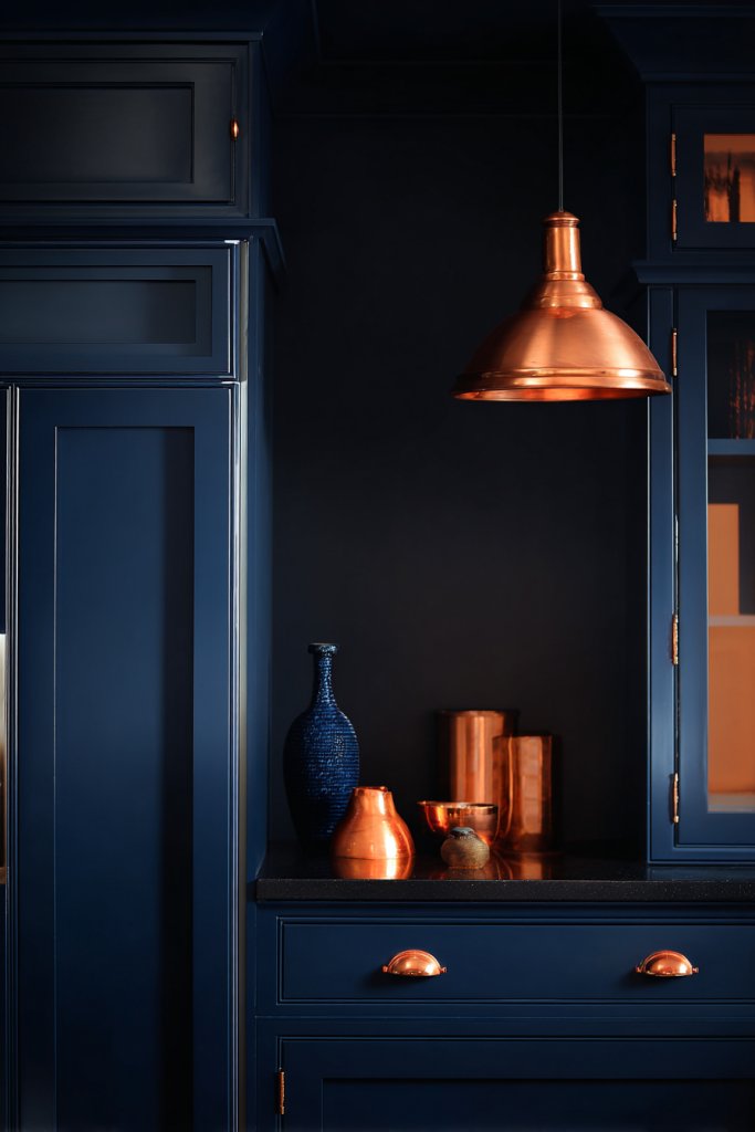 Select navy cabinets with matte or semi-gloss finishes—pair with durable quartz or marble countertops in light shades. Hardware should be in warm copper—handles, knobs, fixtures—to tie everything together. For the backsplash, consider patterned tiles or textured metallic finishes. Incorporate layered lighting—pendants, under-cabinet LEDs—to highlight the color contrast. Keep the layout elegant and uncluttered.