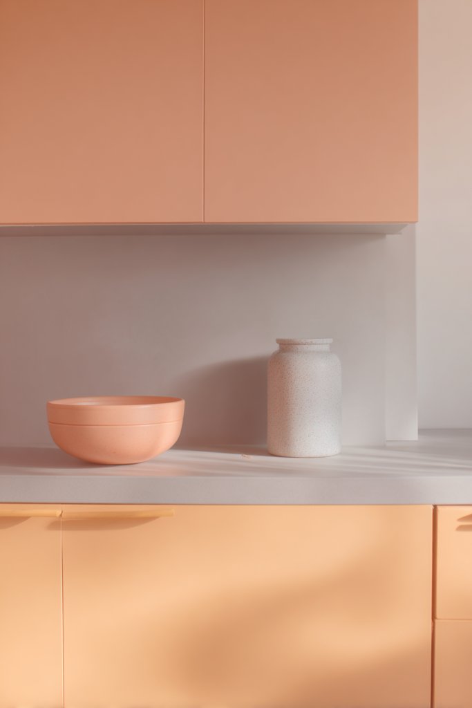 Picture peach-colored cabinets with a matte finish paired with light gray countertops and walls. The soft peach adds a subtle warmth and sweetness, while gray tones keep the look balanced and modern. Incorporate textured textiles like linen or cotton for curtains or cushions. Metallic fixtures in brushed nickel or gold add a touch of elegance. The overall ambiance is cheerful, soft, and inviting—a perfect family space.
