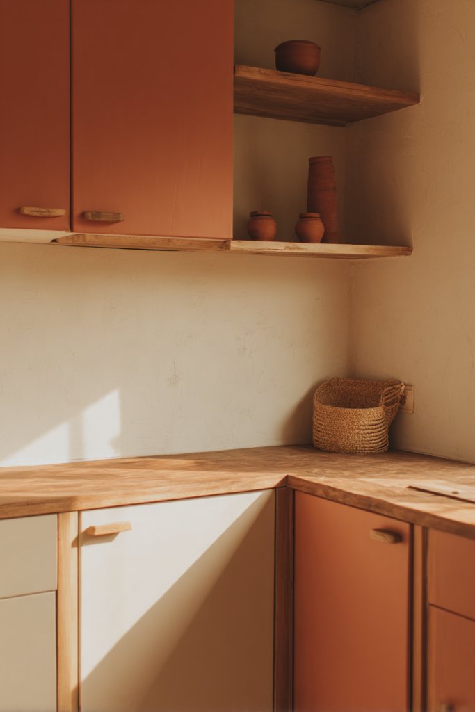 Picture upper cabinets painted in earthy terracotta, their warm hue glowing softly in the light. The lower units are finished in a gentle cream, balancing the boldness above. Natural wood accents on handles or open shelves enhance the organic vibe. A warm-toned backsplash, perhaps with terracotta tiles or subtle mosaic, completes the look. The overall effect is a cozy, inviting environment that feels both timeless and luxurious.