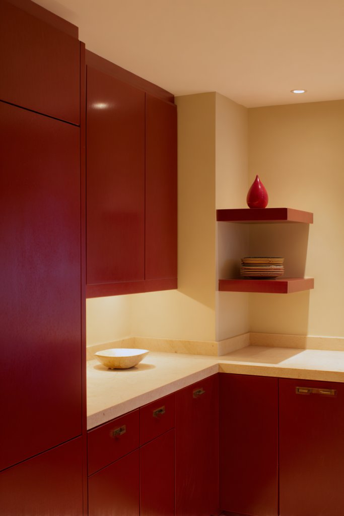 Choose a rich crimson red for your cabinetry—matte or semi-gloss for durability. Pair with beige or cream quartz or stone countertops that are easy to maintain. Hardware should be in warm metallic tones—brass or gold—to complement the palette. The backsplash can feature textured tiles or a warm patterned design. Incorporate layered lighting—pendant or under-cabinet LEDs—to create a cozy, inviting glow. Keep the layout open and accessible.