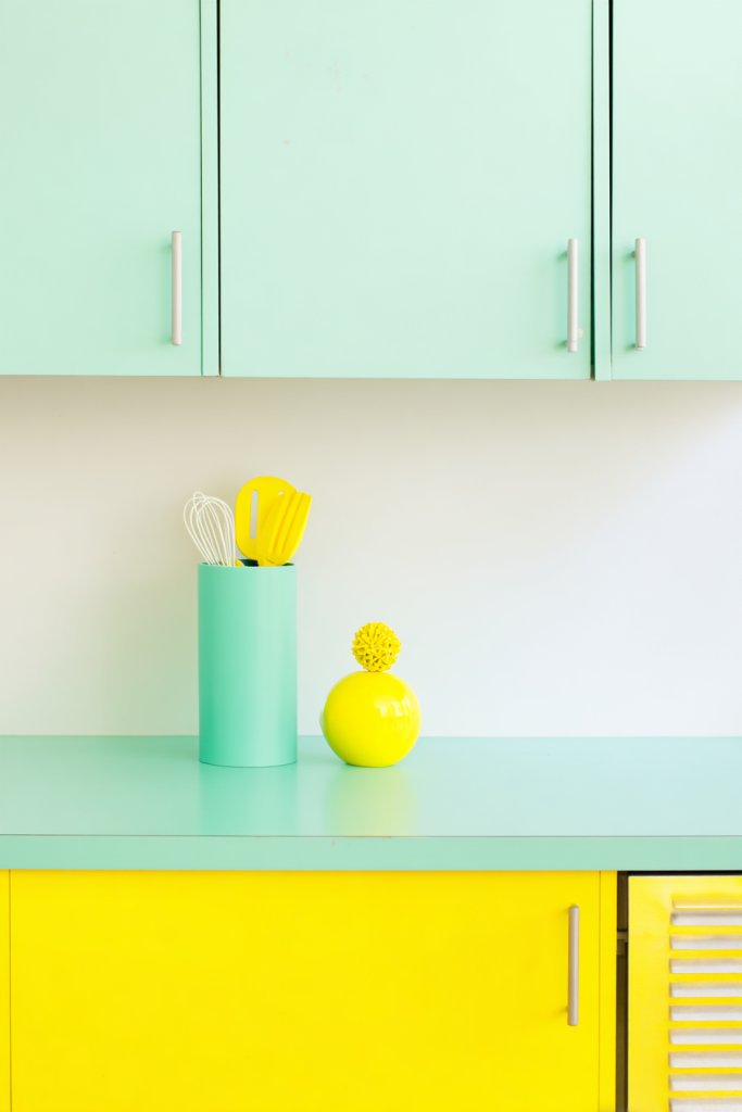 Visualize mint green cabinets with a matte or satin finish, contrasted with sunny yellow countertops or accents. The cool mint provides a calming backdrop, while the yellow injects lively, energetic vibes. Incorporate colorful accessories—vases, utensils, or small appliances—in matching shades. A patterned backsplash in yellow and white or mint and gray adds visual interest. The overall look is refreshing, energetic, and fun.