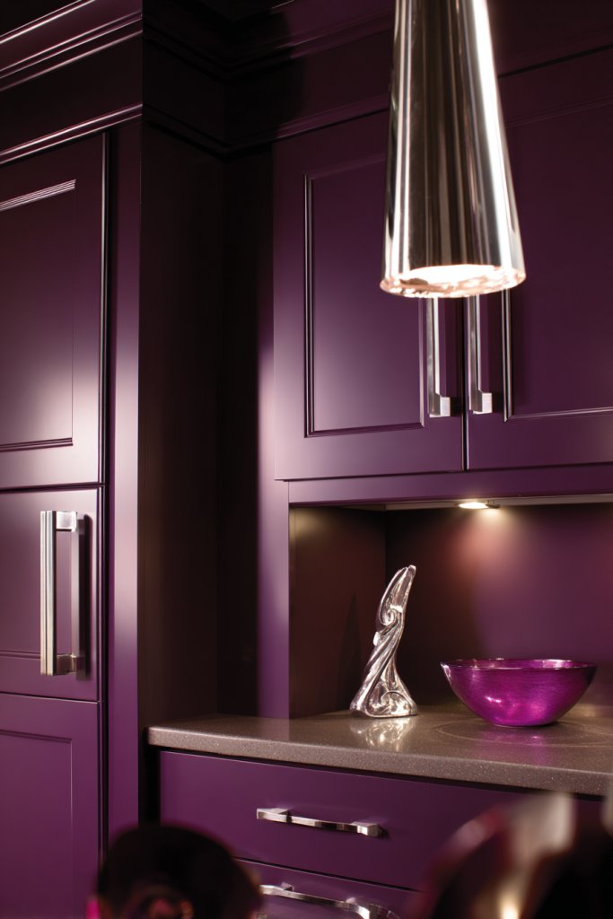 Visualize plum-colored cabinets with a matte or satin finish, complemented by silver hardware and fixtures. The deep purple adds depth and a regal vibe, while silver accents—handles, faucets, or lighting—bring a sleek, contemporary touch. Pair with a light marble or quartz countertop with subtle veining, and perhaps a textured or metallic backsplash. The overall effect is luxurious, modern, and eye-catching. Soft lighting enhances the richness of the hues.