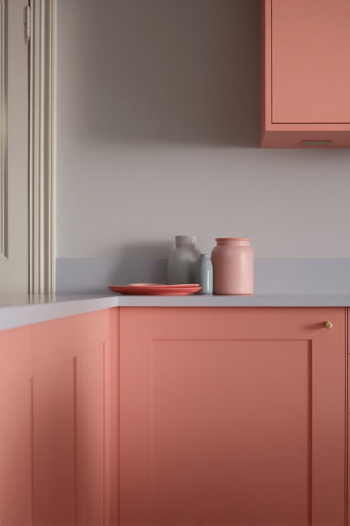 Imagine coral-colored cabinets with a matte or satin finish paired with light gray countertops and walls. The coral adds a soft, lively warmth, while gray tones keep everything grounded and neutral. Incorporate textured textiles—linen or cotton—in matching shades for curtains or cushions. A simple backsplash in neutral or subtle patterns completes the look. The overall effect is cheerful, elegant, and balanced.