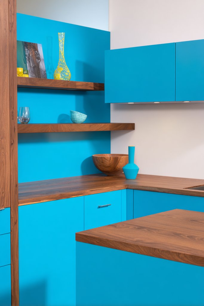 Select durable cyan cabinetry—matte or semi-gloss—paired with natural walnut countertops that showcase the grain. Hardware in black, bronze, or brass can tie the look together. For the backsplash, consider textured tiles or neutral designs with subtle patterns. Use layered lighting—pendant fixtures, under-cabinet LEDs—to highlight the colors. Keep the layout open and functional, emphasizing the bold contrasts.