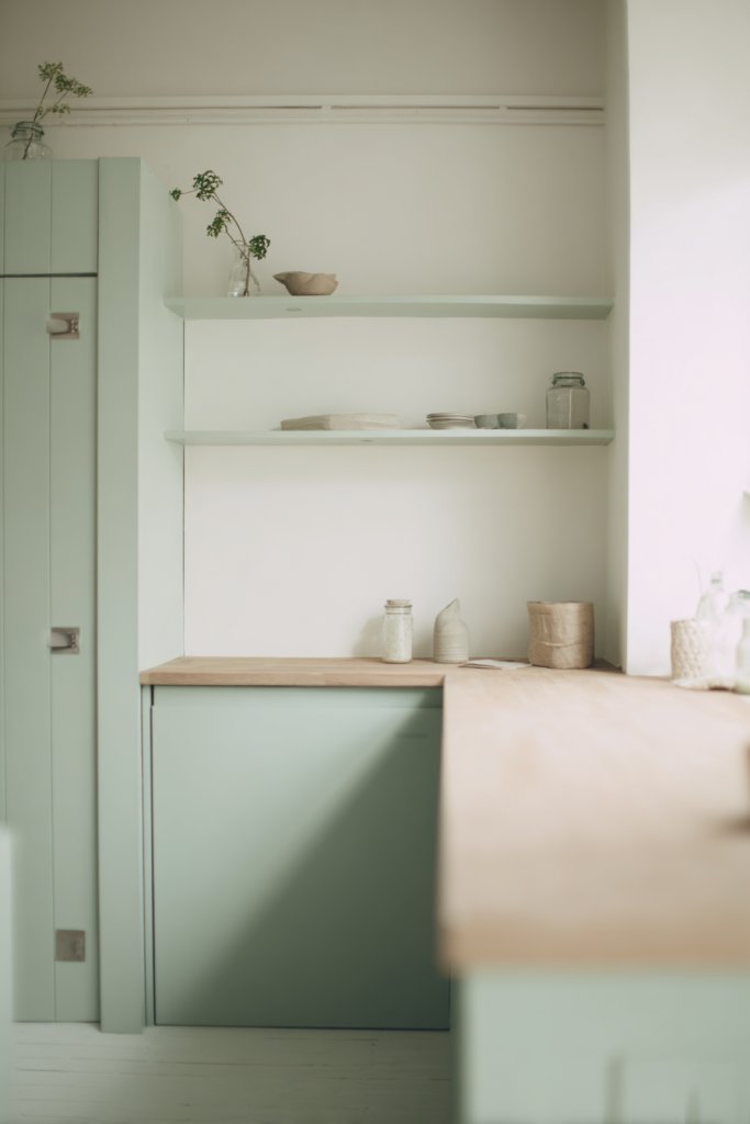 Picture mint green cabinets with a matte finish, complemented by warm oak or birch wood countertops and open shelves. Think of soft, textured textiles like linen curtains or cushioned seating in pastel shades. The walls are painted in a neutral beige or light gray to enhance the airy feel. Subtle metallic fixtures in brushed nickel or matte black add a modern touch without overpowering the gentle color palette. The overall look is inviting, fresh, and full of light.