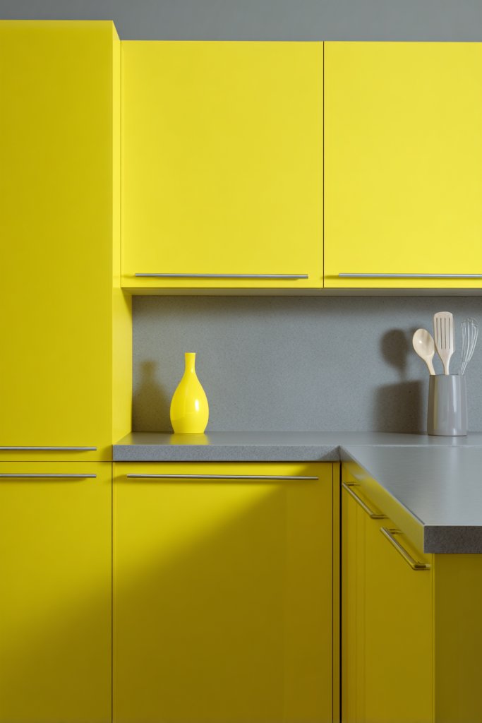 Visualize sunny yellow cabinets with a matte or semi-gloss finish, paired with sleek gray countertops and walls. The yellow adds vibrancy and warmth, while the gray tones down the brightness for a balanced look. Accentuate with minimalist metallic hardware—silver or brushed nickel—to keep it modern. A patterned backsplash in gray and white adds visual interest without overwhelming. The space feels lively, fresh, and perfectly balanced.