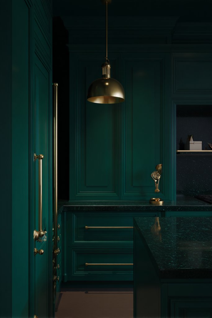 Looking to add a touch of luxury and depth to your kitchen? Deep emerald green paired with brass accents creates an opulent, high-end feel. This combination is perfect for those who love a rich, sophisticated environment that feels both modern and timeless. Who wouldn’t want a kitchen that exudes elegance?