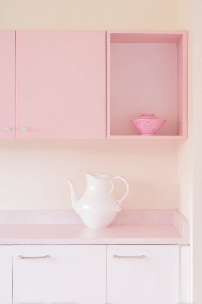 Select pastel pink paint or laminate for your cabinets—opt for durable finishes that withstand daily use. Pair with white quartz or marble countertops to keep the look fresh. Use white or light-colored hardware—like brushed nickel or white ceramic knobs—to blend seamlessly. For the backsplash, consider a subtle patterned tile or simple white subway tiles. Incorporate soft lighting—pendant lights or under-cabinet LEDs—to enhance the cheerful vibe. Keep the layout bright and uncluttered for maximum charm.
