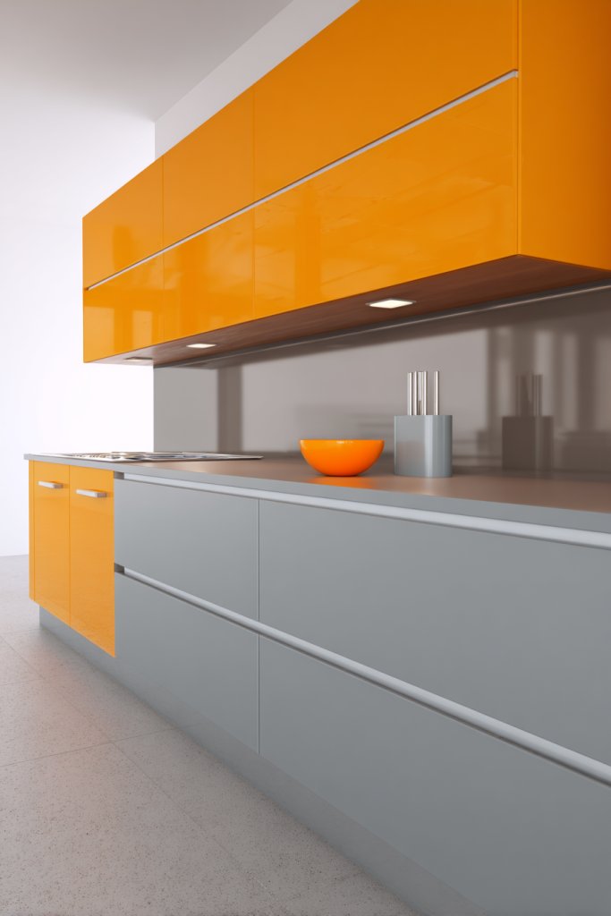 Picture orange cabinets with a matte or semi-gloss finish, contrasted with sleek light gray countertops and walls. The orange injects energy and warmth, while gray tones down the brightness for a balanced look. Minimalist hardware in silver or black keeps the focus on the bold colors. A subtle backsplash in a neutral hue or simple pattern complements the palette. Bright, layered lighting enhances the cheerful atmosphere, making the space feel fresh and modern.