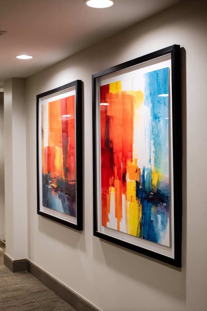 Imagine large canvases featuring abstract shapes in vibrant reds, blues, and yellows hung at eye level. The bold color palettes create focal points that energize the space. Frameless or minimalist frames keep the focus on the art itself, making the hallway feel curated and stylish. The artwork’s dynamic compositions add movement and energy, transforming the hallway into a modern gallery.