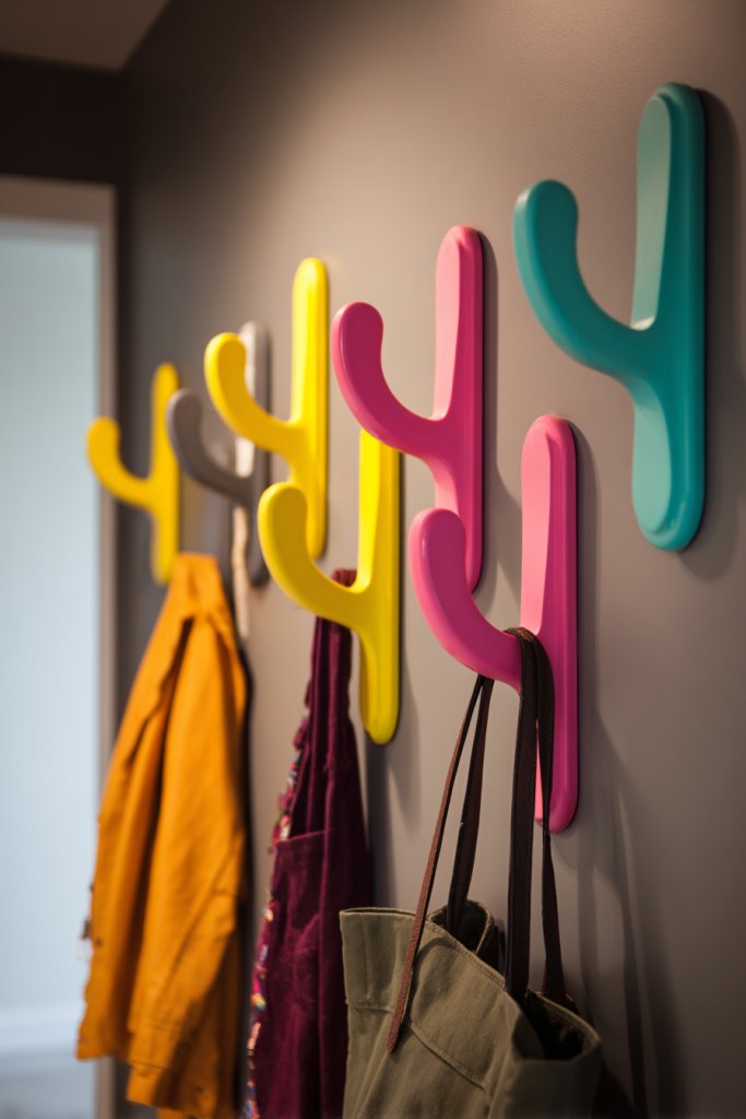 Imagine a wall lined with hooks shaped like playful animals or geometric shapes in bright hues—red, yellow, and teal. Each hook not only holds coats and bags but also adds a splash of personality. The varied heights and styles create a lively visual rhythm. It’s like a mini art installation that’s both practical and whimsical.