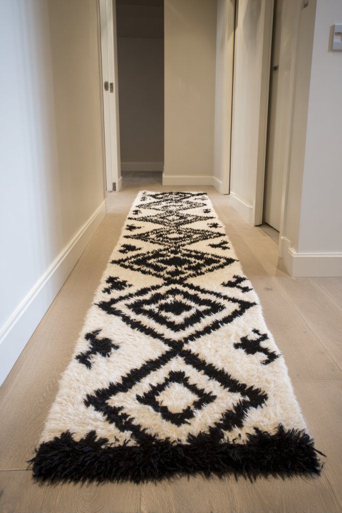 Picture a bold geometric rug with black and white triangles elongating the hallway, guiding visitors inward. Or a colorful, abstract design that brings a playful vibe. Textured patterns like shag or woven motifs add tactile interest, inviting guests to feel the space. The rug becomes a visual anchor that complements your wall decor and furniture.