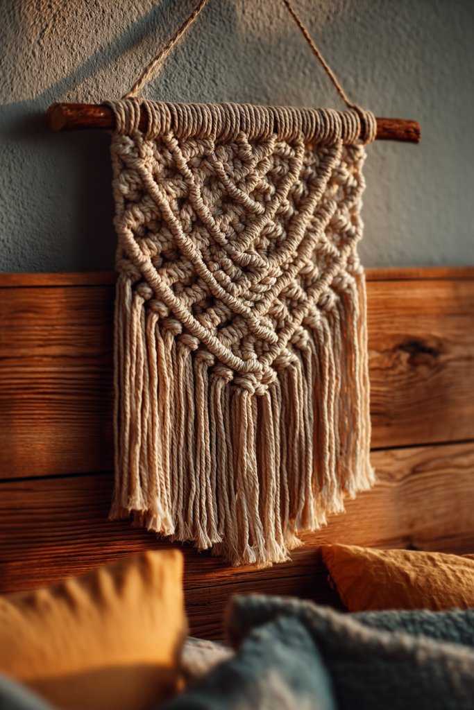 Visualize a large, intricate macramé tapestry hanging above your bed, featuring knotted patterns and fringe details. The natural fibers and neutral color palette blend seamlessly with woven textiles, wooden furniture, and soft bedding. The tactile knots and flowing fringe add depth and movement to the wall. It’s a piece that invites you to touch and admire its craftsmanship. The textured surface catches shadows beautifully, adding visual interest.