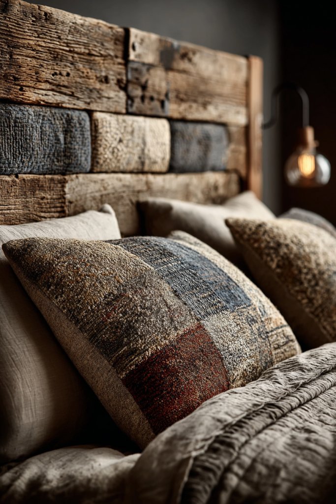 Imagine a headboard made from a patchwork of colorful fabrics stretched over a wooden frame, or reclaimed wood planks arranged in a geometric pattern. The textures and colors create visual interest and a tactile element that’s inviting. It extends the aesthetic of your room, tying together bedding and decor in a cohesive way. The natural grain or vibrant textiles add warmth and character, making your bed the star of the space.