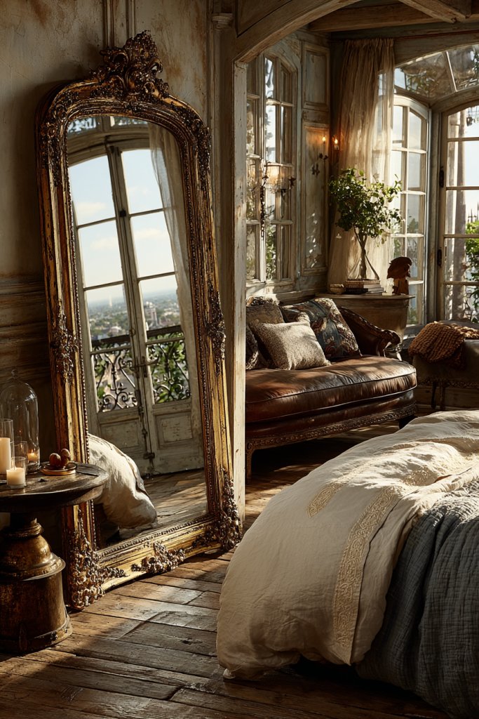 Picture a large, ornate vintage mirror with a gilded frame hanging above a dresser or beside the bed. The mirror’s aged patina and intricate details add character and historical flair. When sunlight hits the mirror, it bounces around the room, brightening dark corners. The reflection also creates a sense of depth, making the space appear bigger and more inviting. It’s a functional piece that doubles as art.