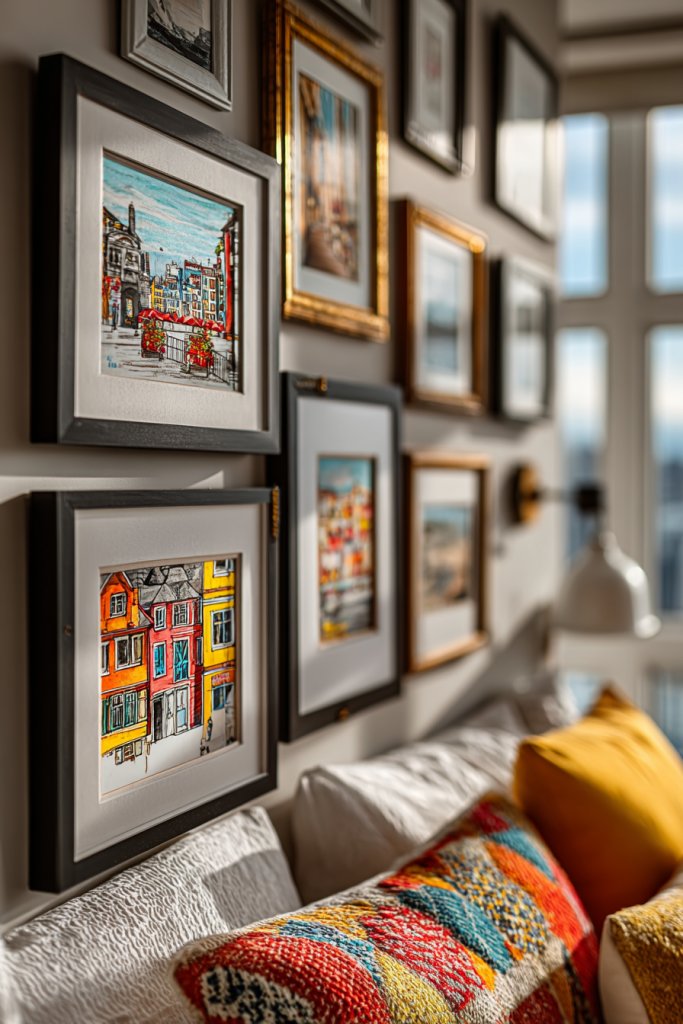 Visualize a wall adorned with an eclectic mix of framed prints, photographs, and artwork in various sizes and styles. Use colorful mats or frames to add pop and cohesion. The arrangement creates a lively visual rhythm that draws the eye and reflects your personality. Incorporate images of travels, favorite quotes, or abstract art to keep it interesting. The varied textures and colors make the wall feel dynamic and personal.