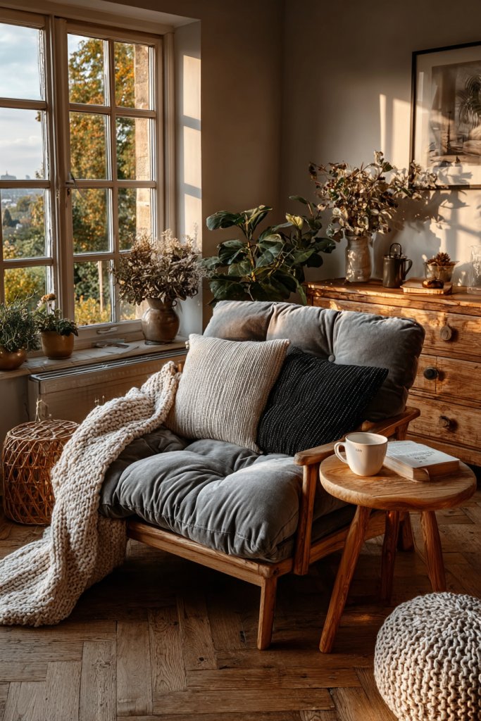 Imagine a plush armchair in a soft fabric, nestled in a corner with a small side table beside it. The chair is topped with a textured throw and a few decorative pillows, inviting you to sink in. Nearby, a small side table holds your favorite mug or a stack of books. Soft lighting—like a dedicated floor lamp or wall sconce—complements the setup. The space feels intimate and tranquil, perfect for unwinding after a busy day.