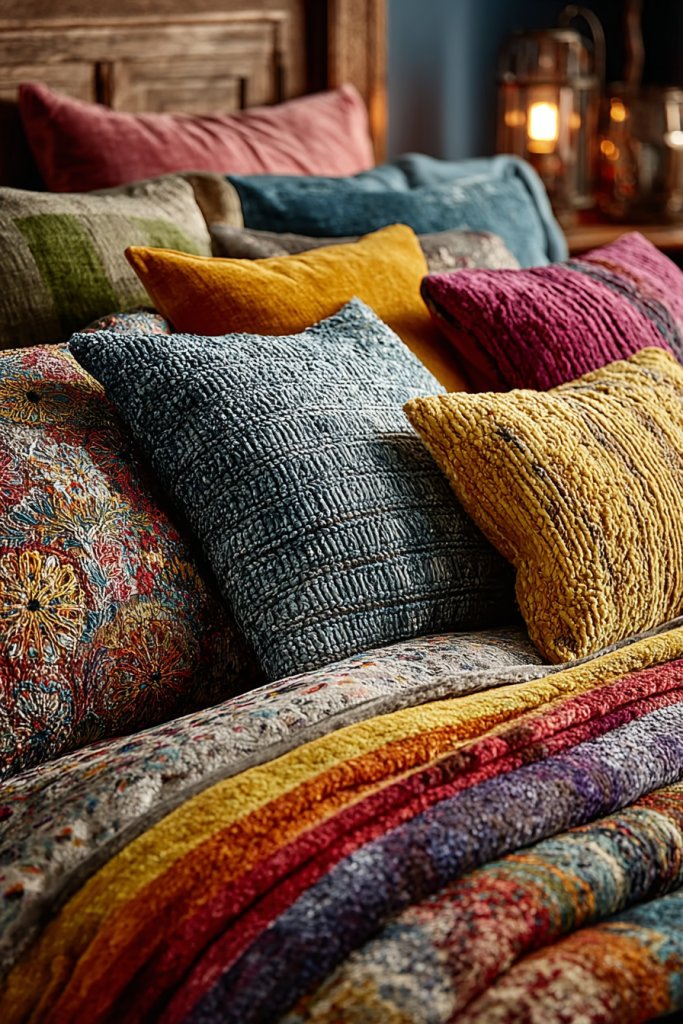 Imagine a bed dressed in linens in a soothing base color like white or beige, accented with a variety of throw pillows in different textures—knits, velvets, embroidered fabrics—in bold or pastel hues. The mix-and-match approach creates visual interest and a cozy, layered look. The textures invite touch, while the colors reflect your personality and mood. It’s like a curated fashion ensemble for your bed.