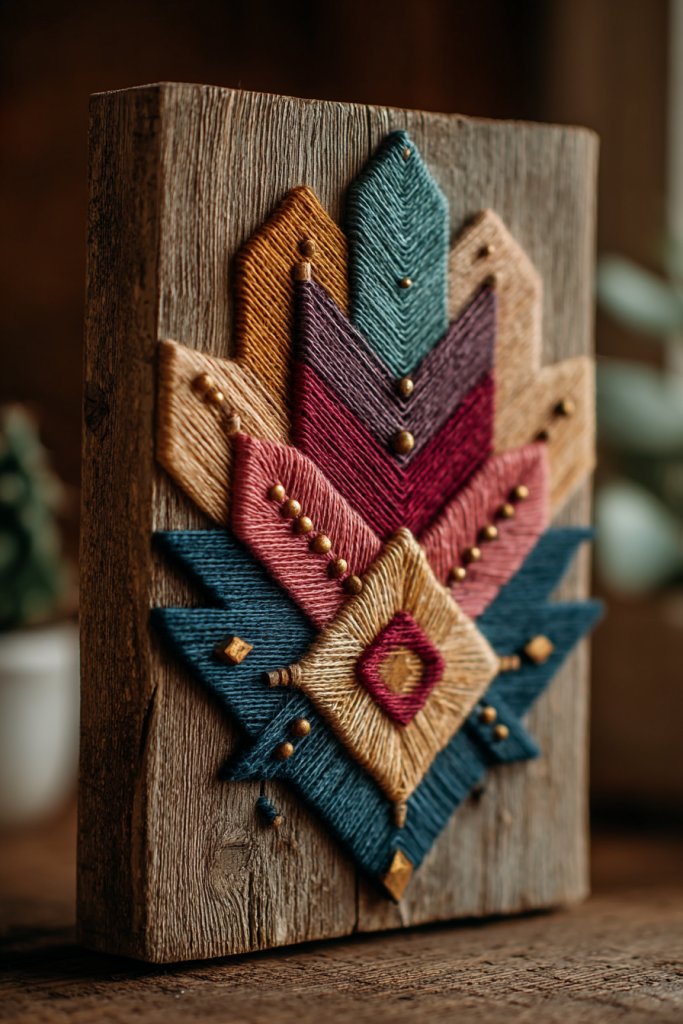 Imagine a geometric or floral design crafted from nails hammered into a wooden board, with colorful thread woven in intricate patterns. The textured lines and bold shapes make the piece stand out, creating a sense of depth and movement. The vibrant thread against natural wood or painted backgrounds adds visual interest and a pop of color. It’s a piece that invites admiration and touches.
