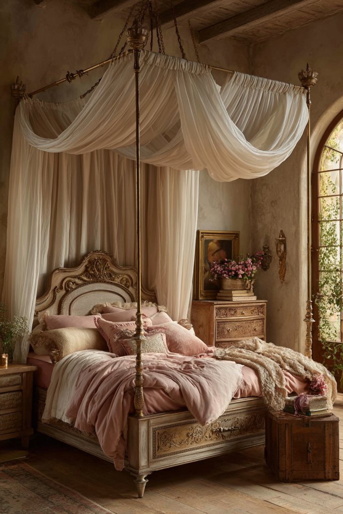 Start by selecting a vintage or vintage-inspired bed frame, which can be found at flea markets or vintage stores. Choose a canopy fabric that complements your room’s color palette—light and airy fabrics work best for a romantic feel. Hang the canopy from the ceiling using ceiling hooks or a sturdy frame that surrounds the bed’s perimeter. Use decorative finials or tassels to finish the look. Layer your bedding with soft sheets, comforters, and decorative cushions to make the bed inviting.