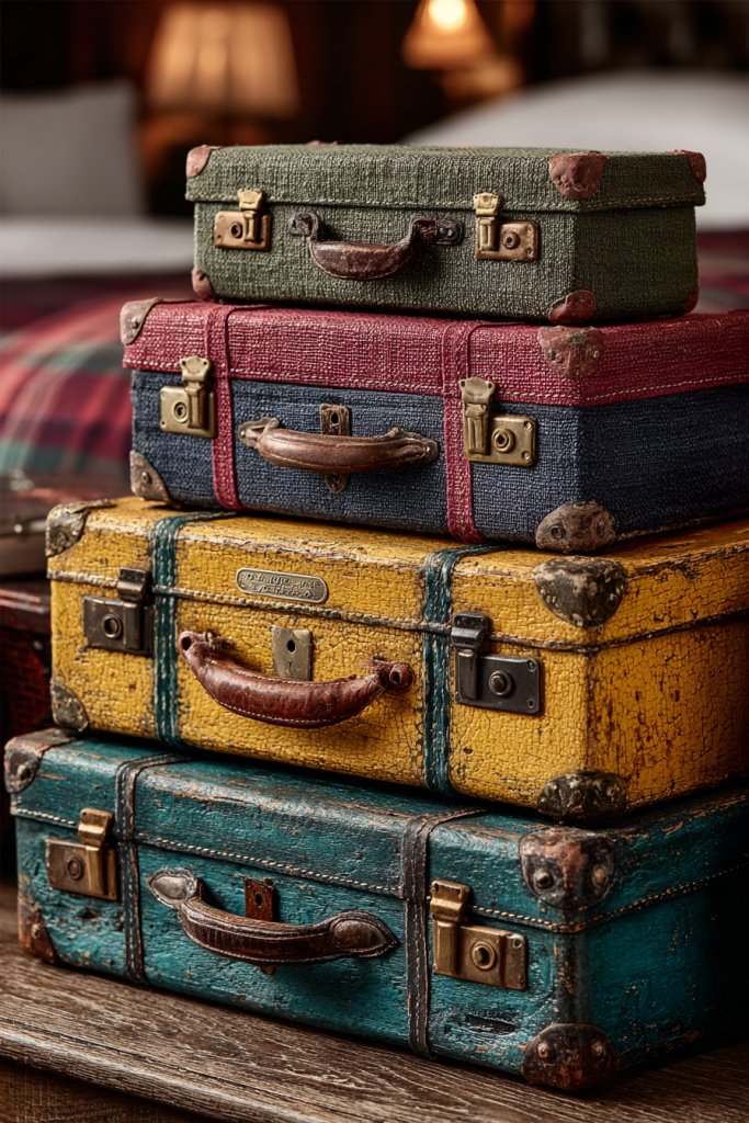 Picture a stack of vintage suitcases in different sizes and finishes, placed beside your bed or under a window. The distressed leather, fabric, or metal accents add texture and visual depth. They can serve as side tables or decorative pedestals, with the top suitcase acting as a surface for a lamp or decorative item (avoid actual vases or plants to stay within restrictions). The collection creates a charming, travel-inspired vibe.