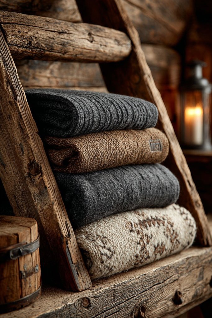 Picture a weathered wooden ladder leaning against a wall, with plush blankets and textured throws draped over its rungs. The natural grain and imperfect finish add rustic charm and warmth. It becomes a visual focal point, blending practicality with aesthetic appeal. Nearby, decorative baskets or vintage accessories complete the look, making your space feel lived-in and cozy.