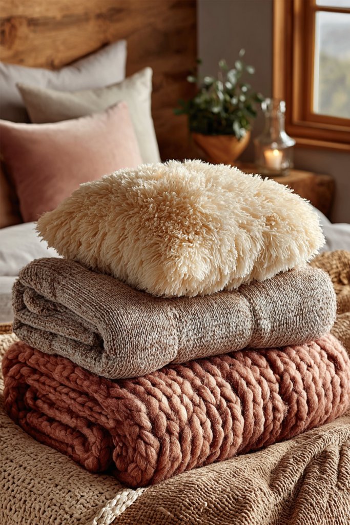 4. Layered Textiles: Plush Rugs and Fluffy Throw Blankets