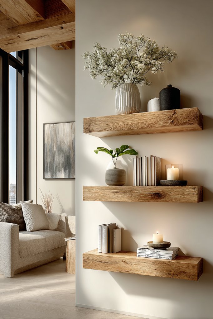 Use floating shelves of different lengths and finishes—wood, metal, or painted—to match your decor. Arrange them asymmetrically for an eclectic vibe or symmetrically for a more polished look. They work well above beds, desks, or in empty corners, adapting to various room sizes. Combine with baskets or decorative storage boxes underneath for hidden organization. Seasonal decor changes can be easily swapped on these shelves.