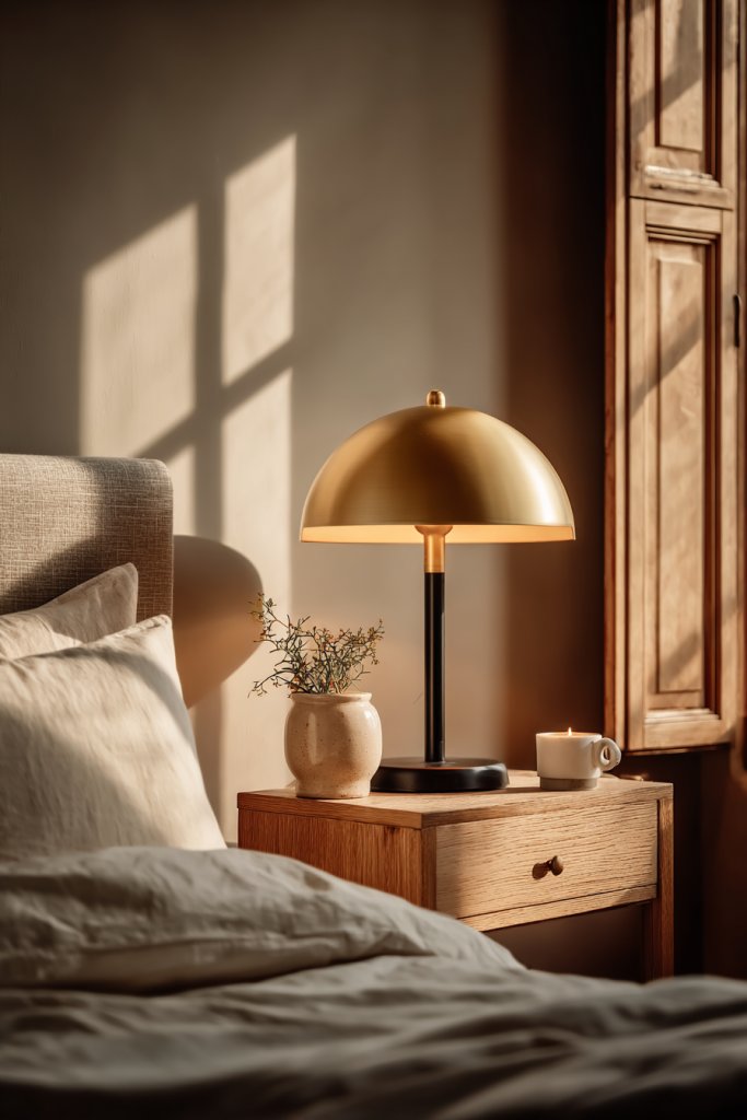 Pick a nightstand that aligns with your room’s aesthetic—compact, open-shelf, or drawer styles all work. Mount or place it beside your bed, ensuring it’s sturdy and level. Choose a statement lamp that complements the scale of your nightstand and adds visual weight. Keep the surface clear of clutter—only a small clock, a book, or a decorative object. Use soft white bulbs for a warm, inviting glow.