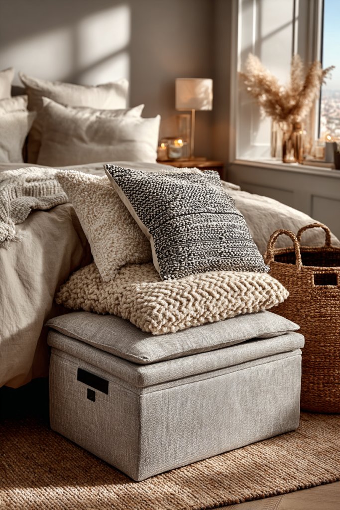 Envision a plush upholstered ottoman in a neutral shade, topped with a decorative tray or cushion in a vibrant fabric. Its interior opens to reveal spacious storage for your extra linens or accessories. Place it at the foot of your bed or in a corner, where it invites you to sit or rest your feet. The layered look—soft textiles on top, hidden storage below—adds both function and style.