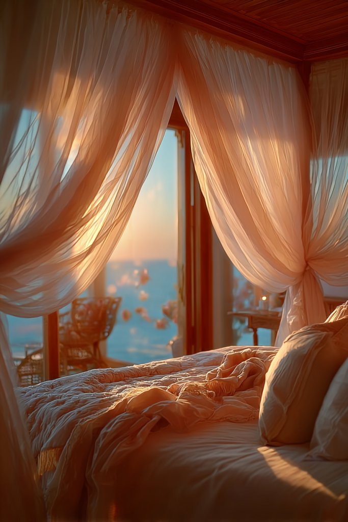 Imagine a delicate, airy fabric draped from a circular frame or ceiling-mounted hooks above your bed. The fabric gently pools around the sides, creating a tent-like sanctuary that feels intimate and inviting. The sheer material catches the light, casting a subtle glow that enhances the romantic ambiance. Soft, neutral colors like white, blush, or cream work beautifully, adding a sense of calm and elegance.