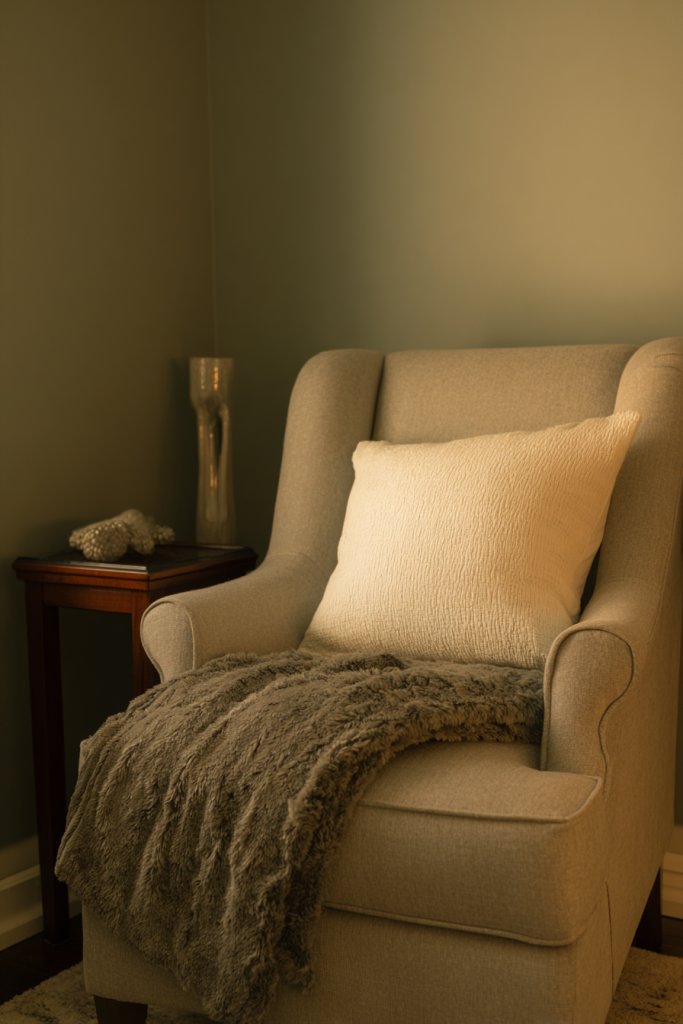 Picture a plush, oversized armchair with soft textured upholstery, nestled in a corner with a small side table nearby. Layer it with a chunky knit throw and a few textured cushions to boost comfort. Soft lighting—like a wall-mounted sconce or a small floor lamp—creates a warm glow. Adding a small rug underneath grounds the space, making it feel like a true retreat within your home.