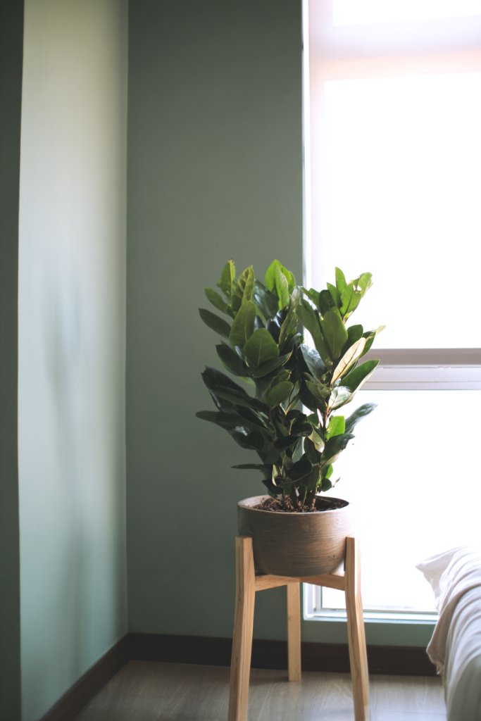 Imagine a collection of low-maintenance succulents or lush ferns in handcrafted wooden pots placed on open shelves or side tables. The natural wood tones warm up the room’s neutral or sage palette, creating a seamless connection to nature. The plants’ varying heights and textures add visual interest, while their vibrant greens energize the space. The overall look is fresh, inviting, and effortlessly stylish.