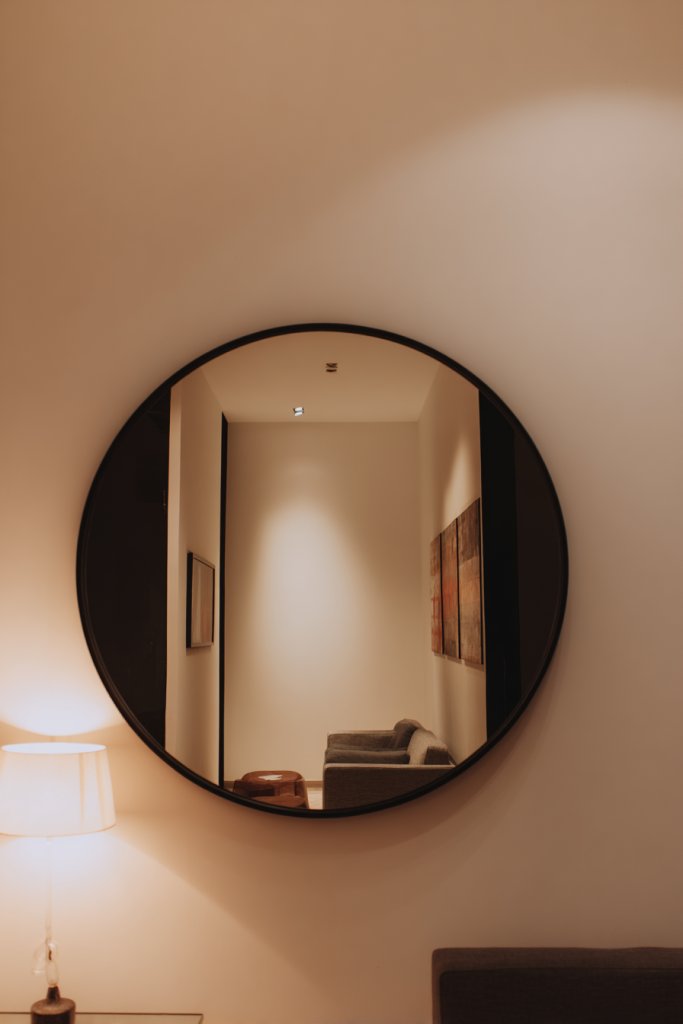 Imagine a sleek, minimal mirror with a slim, matte black or brushed gold frame hanging above your sofa or fireplace. It reflects the room’s natural light, brightening even the darkest corners. The mirror’s size anchors the wall, creating a striking visual center that draws the eye. Pair it with simple, elegant furnishings to keep the focus on this statement piece. The result is a room that feels airy, balanced, and stylish.