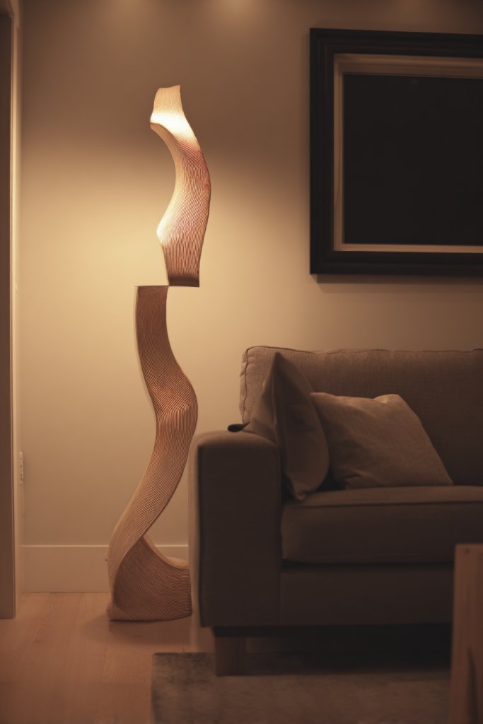 Imagine a tall, sculptural lamp with a curving, organic form in matte black or brushed brass—standing gracefully beside your sofa. Its shape mimics natural forms like a tree branch or flowing water, adding a touch of nature-inspired art. The soft glow from its shade or bulb highlights its unique design, casting interesting shadows. It becomes a functional piece of art that elevates the entire room’s aesthetic.