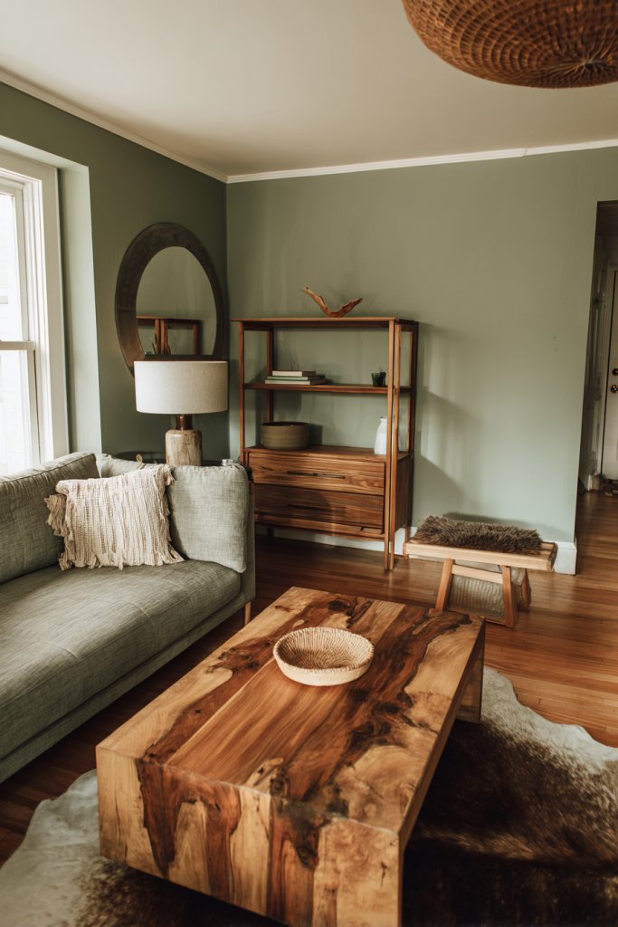 Picture a coffee table crafted from reclaimed oak with a matte finish, its rough texture contrasting beautifully with smooth fabric upholstery. Wooden picture frames, shelves, or side tables bring an organic touch that softens the overall look. The warm tones of the wood complement neutral or sage walls, creating a harmonious environment. The grain patterns and natural imperfections add character and depth, elevating the aesthetic.