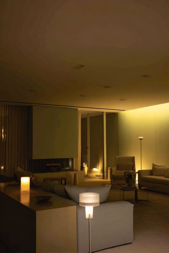 Picture a soft glow from a floor lamp with a textured fabric shade, complemented by warm LED strip lights tucked behind shelves or along architectural features. A set of small table lamps on side tables adds pools of warm light perfect for reading or relaxing. Overhead, a dimmable fixture provides adjustable general illumination. The combination creates a layered, inviting environment that adapts to your mood.