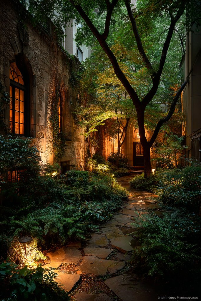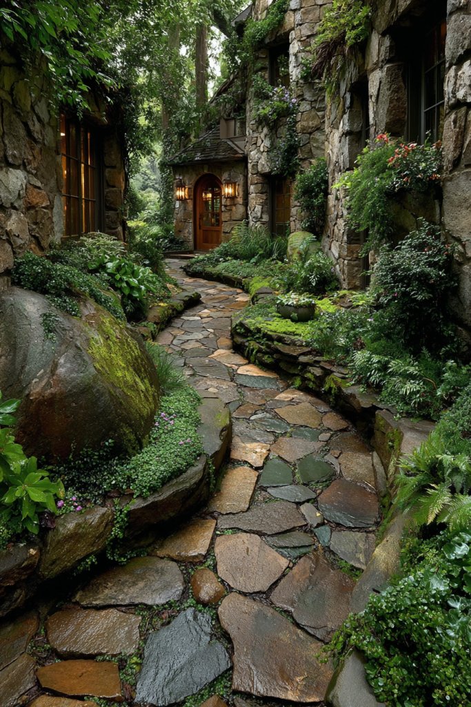 Imagine winding stone steps with uneven edges, bordered by dense ground covers and flowering perennials. The textured stones contrast beautifully with the soft greenery, inviting you to wander and explore. At dusk, the pathway glows softly under ambient lighting, enhancing its rustic charm. It feels both timeless and relaxed.
