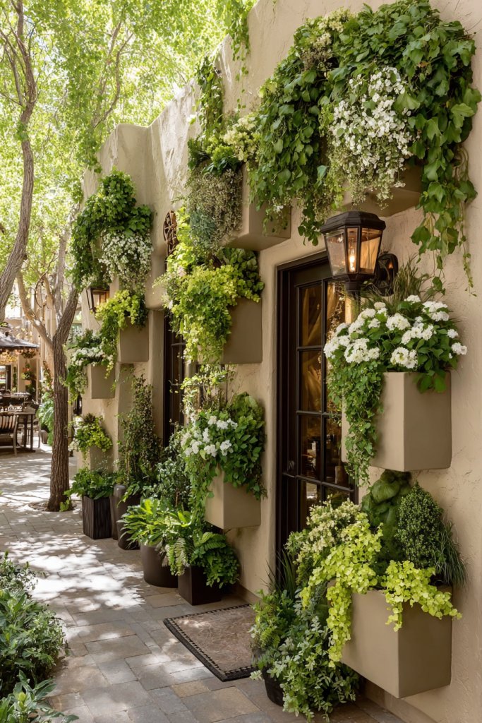 Imagine a sleek wall covered in a mosaic of planters, bursting with leafy greens and colorful blooms. The textured panels add depth, while cascading vines drape down, softening harsh edges. The scent of fresh foliage fills the air, creating a calming atmosphere. Bright sunlight highlights the hues, turning a plain wall into a lush, textured canvas.