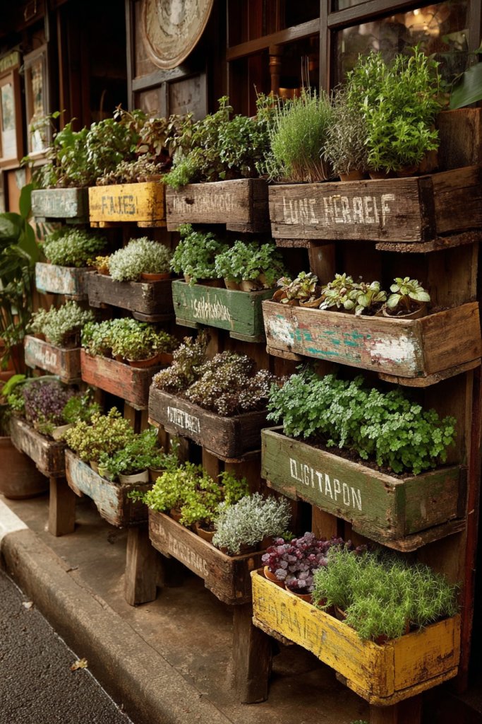 Picture a vertical wall of weathered pallets filled with a variety of plants—herbs, succulents, or flowers—creating a rustic, layered effect. The natural wood tone contrasts beautifully with green foliage, giving a charming, farm-to-table vibe. Small pots or soil-filled gaps bring life and texture to the structure.