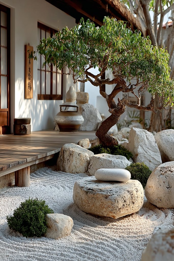 Use raked gravel or sand to create patterns, and incorporate a few sculptural elements like stones or driftwood. Sparse, low-maintenance plants like moss or small shrubs add subtle green touches without overpowering the scene. Keep furnishings minimal—perhaps a simple bench or meditation cushion—if needed. Seasonal accents are optional, maintaining the clean aesthetic.