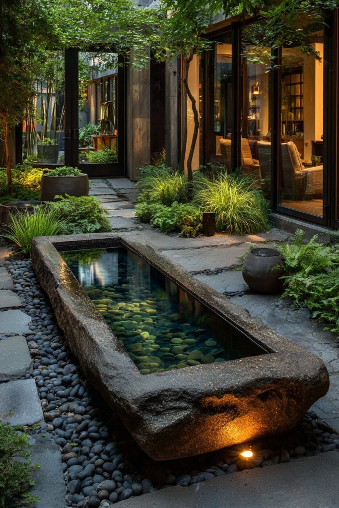 Picture a small, sleek pond with a glassy surface mirroring the sky and surrounding greenery. A gentle fountain adds soft movement, while pebbles and smooth stones border the edge, blending naturally into the landscape. Light plays on the water at dusk, casting shimmering reflections that enhance the peaceful vibe. It’s like having a tiny piece of nature’s serenity right outside.