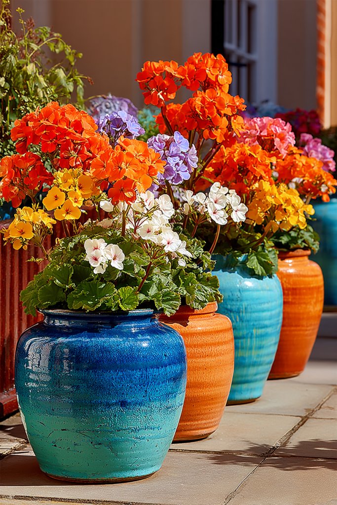 Imagine a collection of decorative pots in different shapes and sizes, filled with bright petunias, zinnias, and trailing vines. They sit on a wooden deck or clustered along a patio, creating a lively mosaic of hues and textures. Cascading flowers spill over the edges, drawing your eye and inviting you to relax nearby. The scent of fresh blooms fills the air, making it a cheerful focal point.