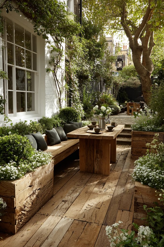 Picture a cozy wooden deck extending from your back door, with integrated rectangular planters along the edges. Tall, leafy greens or colorful blooms spill over, creating a natural barrier and visual interest. A small table and chairs sit nearby, perfect for coffee or meals. The deck’s warm wood tones contrast beautifully with lush foliage, making the space inviting.