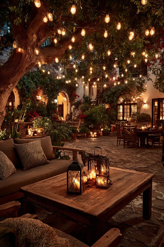 Imagine delicate string lights draped across a pergola or wrapped around trees, casting a gentle glow. Lanterns hang from hooks or are placed on tables, flickering softly with candles or LED bulbs. The ambient light highlights textures and colors, turning shadows into a cozy scene. It’s like bringing a little bit of fairy-tale magic outside.