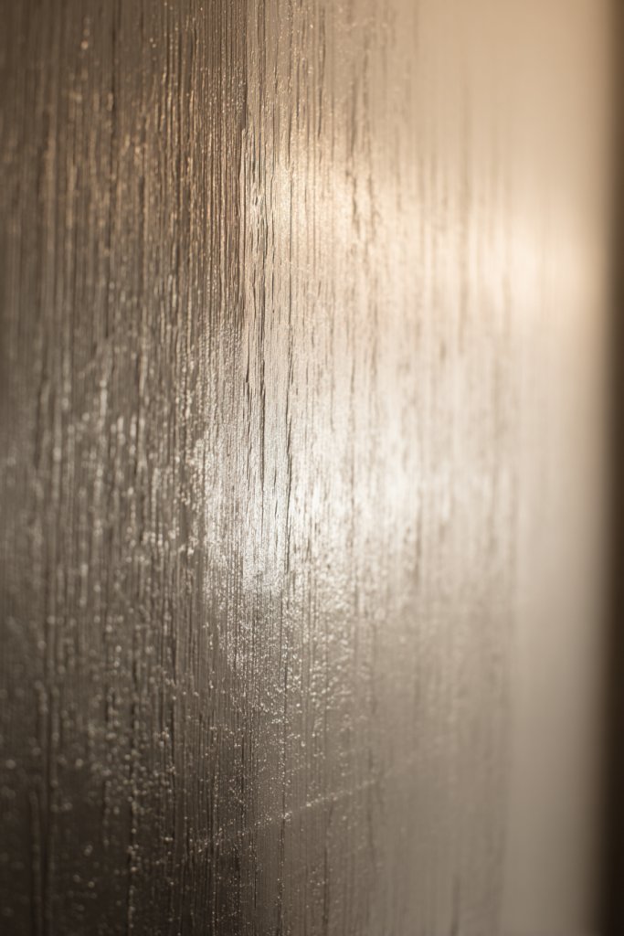 Imagine walls that reflect light with a soft metallic sheen, enhanced by a textured brushstroke finish. The brushed technique creates a directional pattern that catches and disperses light unevenly, adding movement and richness. The subtle shimmer invites attention without overwhelming the senses.