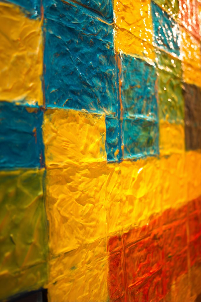 Imagine a wall covered with colorful, textured tiles, each with its own pattern and depth. The layered paint creates the illusion of grout lines and tile surfaces, giving a lively, patterned appearance. The varied textures and hues make the wall a visual feast, full of personality.