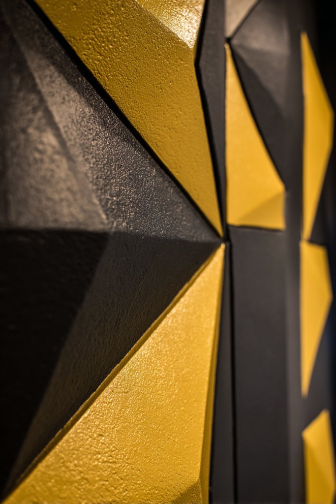Use bold contrasting colors for a striking effect or monochrome shades for a subtle, sophisticated look. This technique works well in contemporary or industrial interiors. You can also vary the size and arrangement of shapes for a more dynamic pattern. Incorporate metallic or glossy accents for extra visual impact.