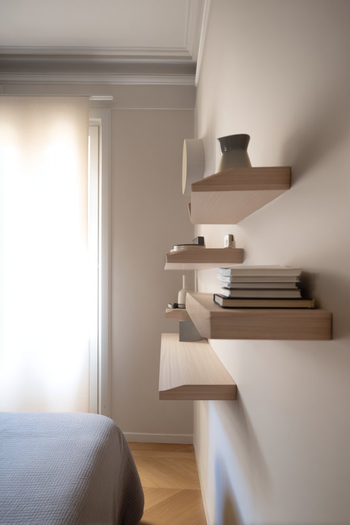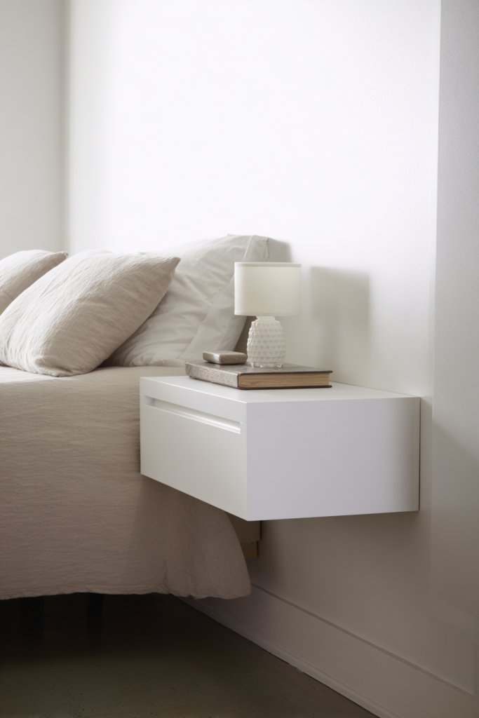 Imagine a minimalist wooden or metal floating shelf mounted on the wall beside your bed, holding a small lamp, clock, or a book. It creates a clean, uncluttered look, making the room feel more open. The absence of legs or bulky bases allows your floor to breathe, adding to the illusion of space.