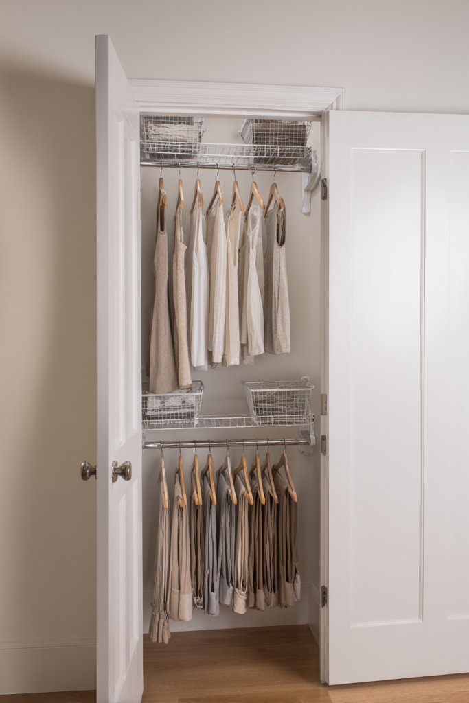Install a double rod system in your existing closet or choose a closet organizer with vertical compartments. Use slim, space-saving hangers to fit more garments. Incorporate hanging shelves or baskets for accessories, scarves, or belts. Consider modular systems that can be customized for your storage needs.